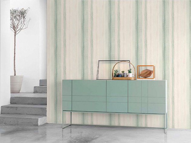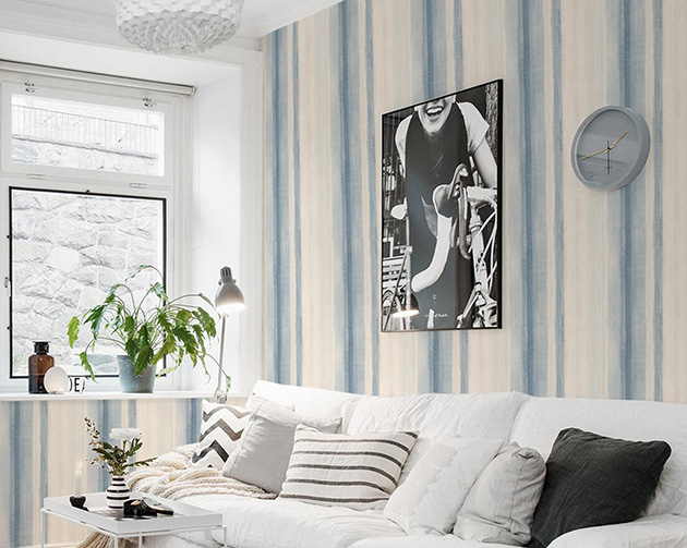 各色条纹,自然、优雅、似沙流一般,轻柔、和缓、静谧;竖条纹增添了空间感。金色条纹壁画,更显绚烂。