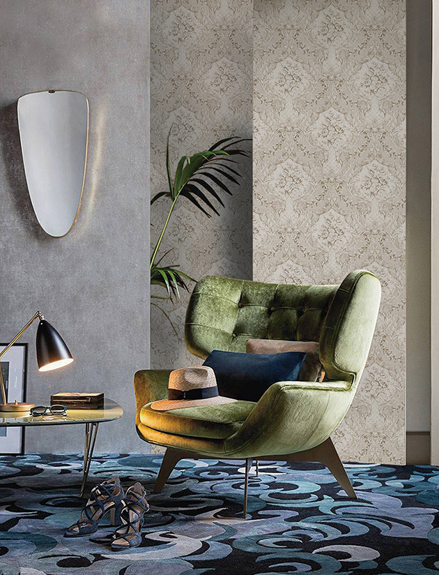 花型优雅,绚丽华贵而不失温润的气质。斑驳暗纹肌理无论作为素色或是带花底色形式表现,整体色彩都和谐又富有层次感,《情醉神秘》中还融入了动物元素——绶带鸟,代表长寿,与牡丹花组合出现,大胆使用重色,画面丰富,寓意美好,华丽时尚,定会成为室内一道靓丽的风景线。